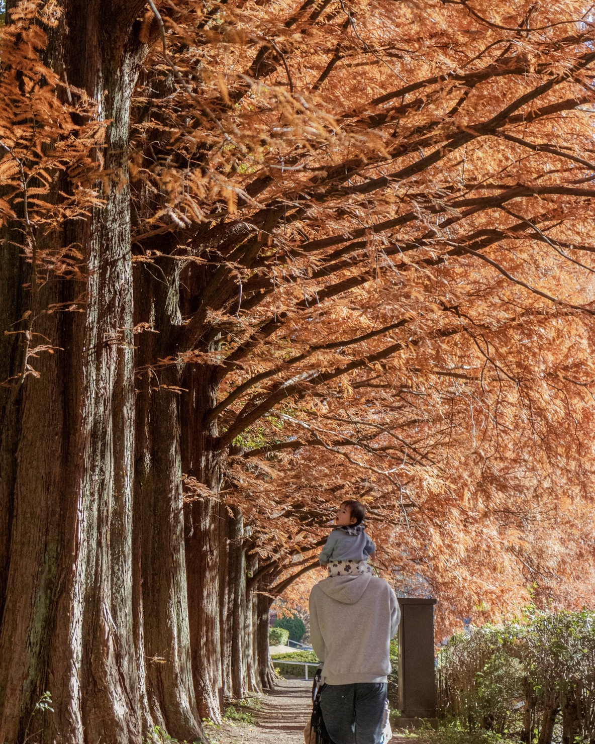 神奈川県立相模原公園のメタセコイヤ並木です。木の根元を通る歩道に行くと、木の葉が太陽の光に透けてオレンジ色にキラキラ輝いて見えます。それが遠くまで続く光景は圧巻です。初めて訪れた娘もこの景色に見惚れているようでした。