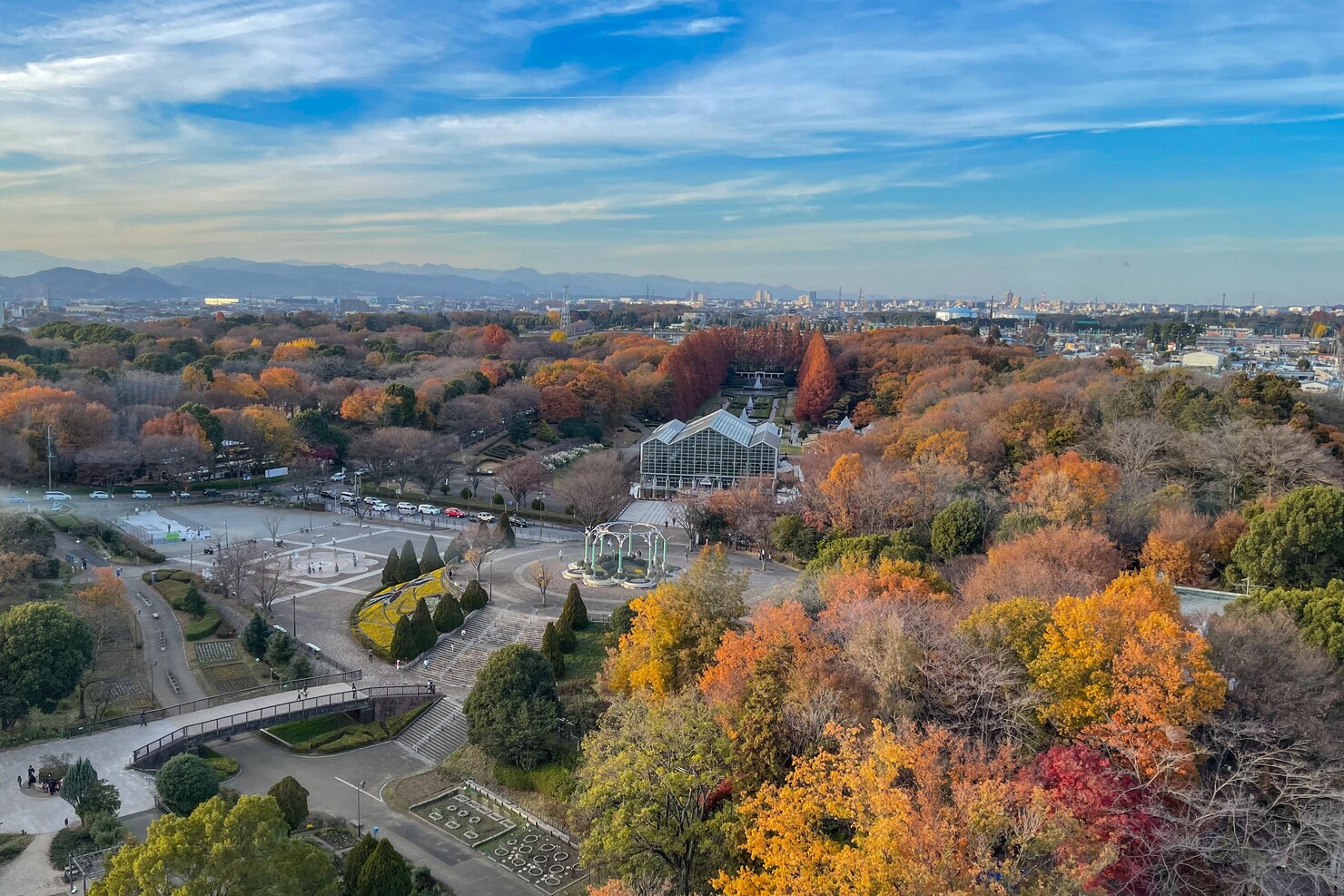 グリーンタワーは相模原麻溝公園にあり、相模原市民なら見たことある方が多いと思います。高さは55メートル、展望室は38メートルの高さがあり、エレベーターで頂上まで昇ると壮大なパノラマを眺められます。ゆっくり紅葉を楽しみました。