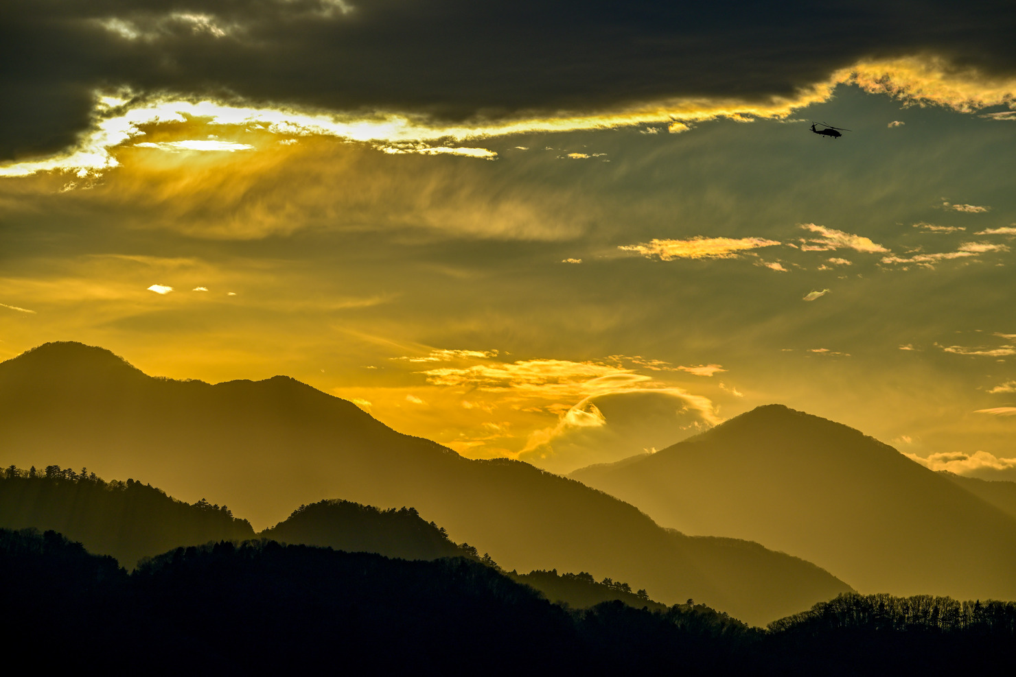 相模原市緑区中沢にある飯縄大権現からみた夕景です。遠くに富士山・大室山・丹沢連峰・津久井湖などが一望できる夕陽のスポットとして有名な場所でありますが、朝の景色もよい。この日は富士山に綿雲のような笠雲がかかり幻想的な夕景となった、上空を横切るヘリコプターを右上にアクセントとして入れてみた。毎年12月と1月にはダイヤモンド富士も楽しめます。