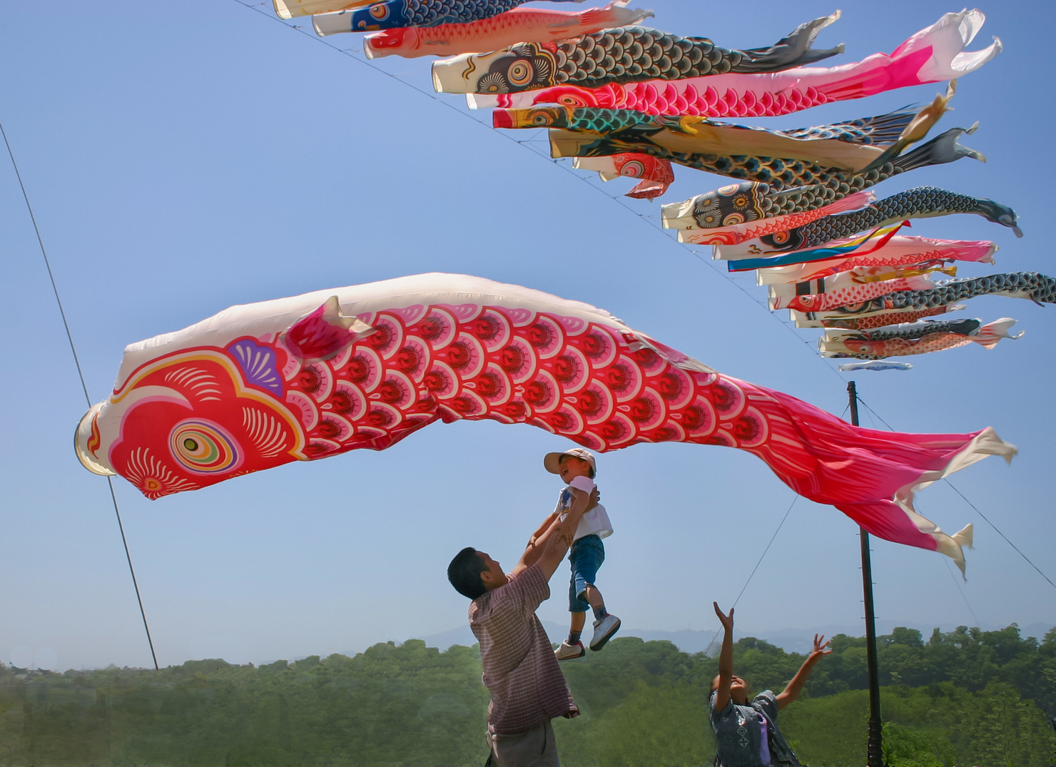 相模川の上空に、青空を背景に元気よく鯉のぼりが泳いでいました。この鯉のぼりは、地域の方々からの寄付だそうです。子どもたちも、この鯉のぼりのようにすくすくと元気いっぱい育ってほしいという願いをこめて撮影しました。
