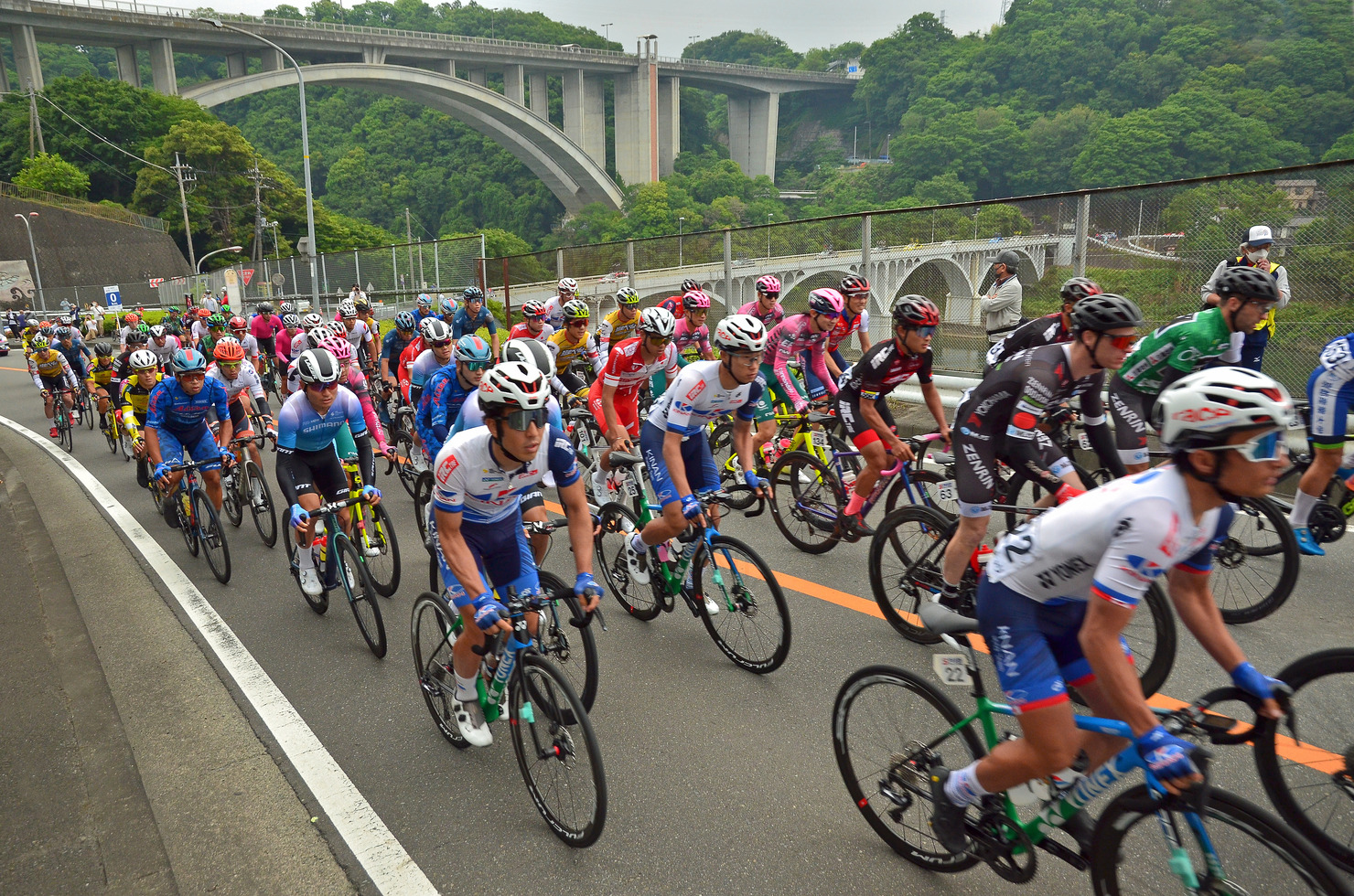 自転車ロードレース「ツアー・オブ・ジャパン」相模原ステージでの一コマです。市街地をパレード走行して、小倉橋を渡ったここからの山道が本気の競い合い!あっという間に過ぎ去って行きました。オリンピックの時は時間が取れず行けなかったので、このレースは見に行けて嬉しかったです。