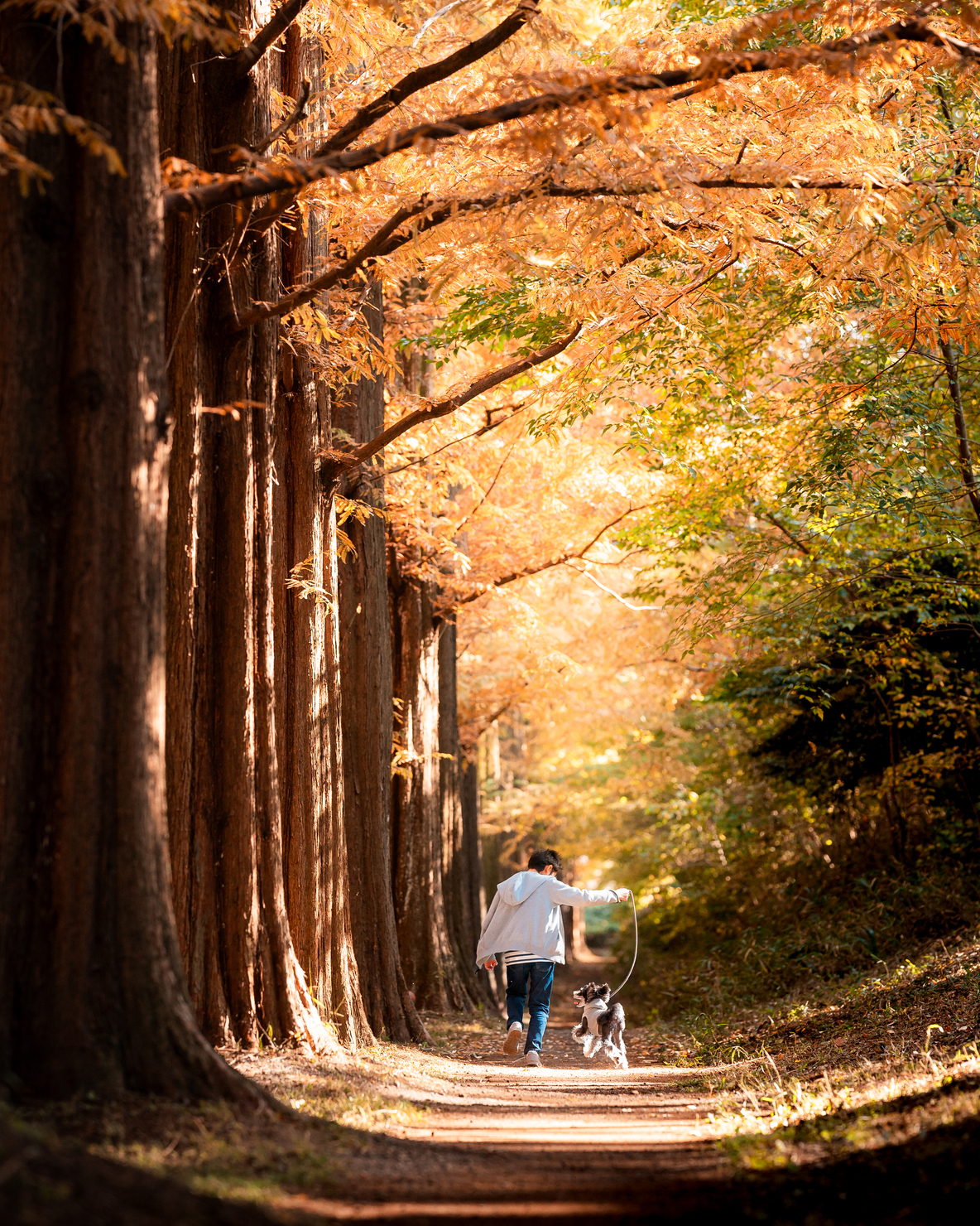 この度はたくさんの素晴らしい作品の中から、我が家のお写真を選んでくださりありがとうございます。四季折々の景色を楽しめる大好きな相模原公園。秋はメタセコイア並木がとても綺麗です。メタセコイア並木の木々から光が射し込み、真っすぐ伸びた道を元気いっぱい走るふたりを撮りました。「よーいどん」と言うと走っちゃうふたり。愛犬が走りやすいようにリードを少し浮かしてくれる優しい息子も残せて、思い出たくさんの一枚になりました。